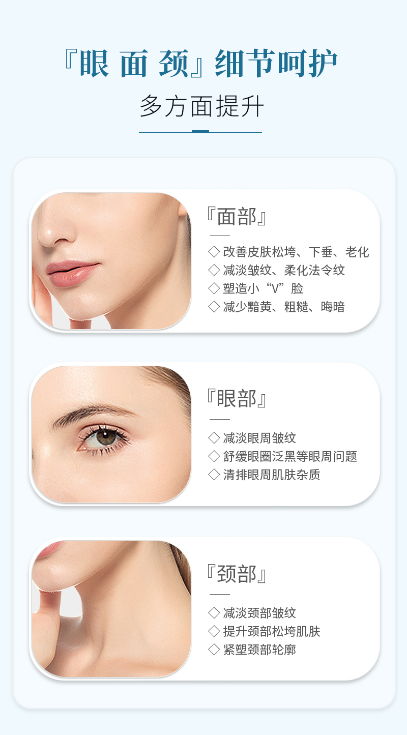 | 功效 | 面部 改善皮肤松垮、下垂、老化、没弹性 减淡皱纹、柔化法令纹 塑造小“V”脸 改善黯黄、粗糙、晦暗 |